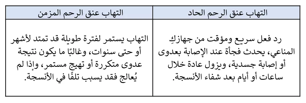 لأن الالتهاب قد يكون حادًا أو مزمنًا، من المهم أن تعرفي الفرق بينهما: